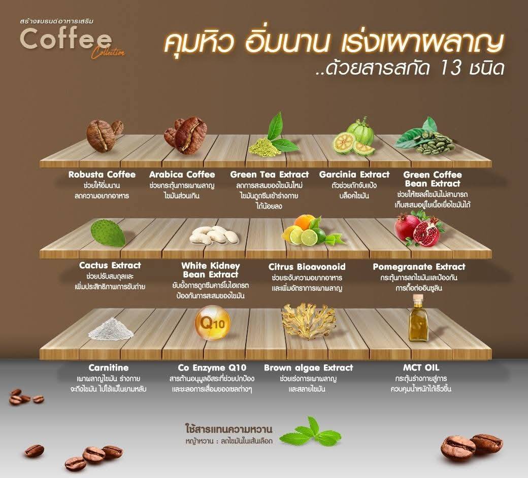 ส่วนผสม: กาแฟอาราบิก้า, สารสกัดจากถั่วขาว, คอลลาเจน, วิตามิน